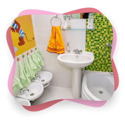 В ванной удобный поддон для мытья деток и 4 детских раковины по росту.